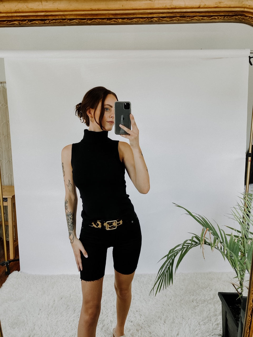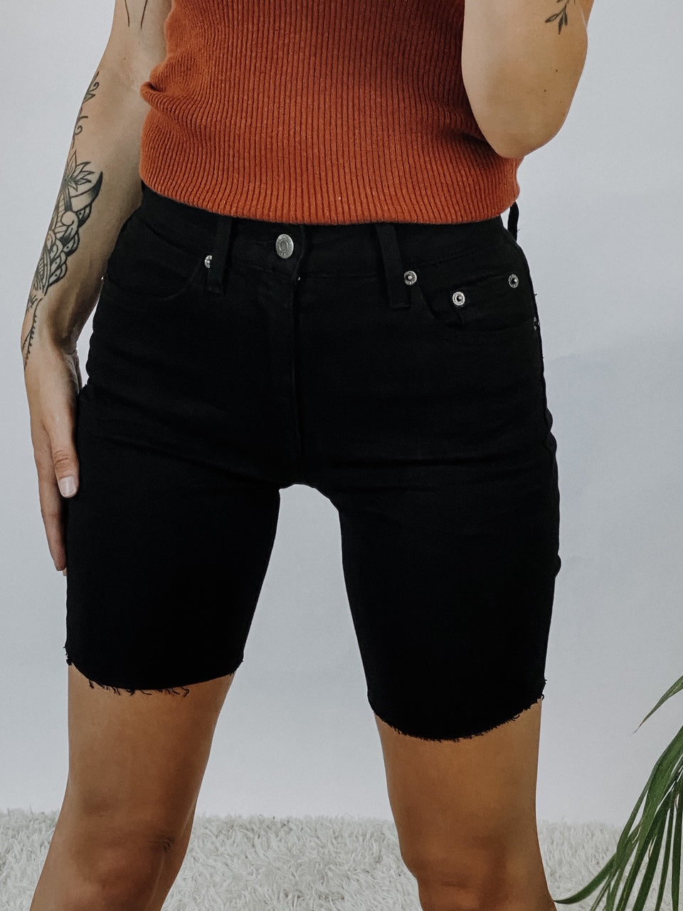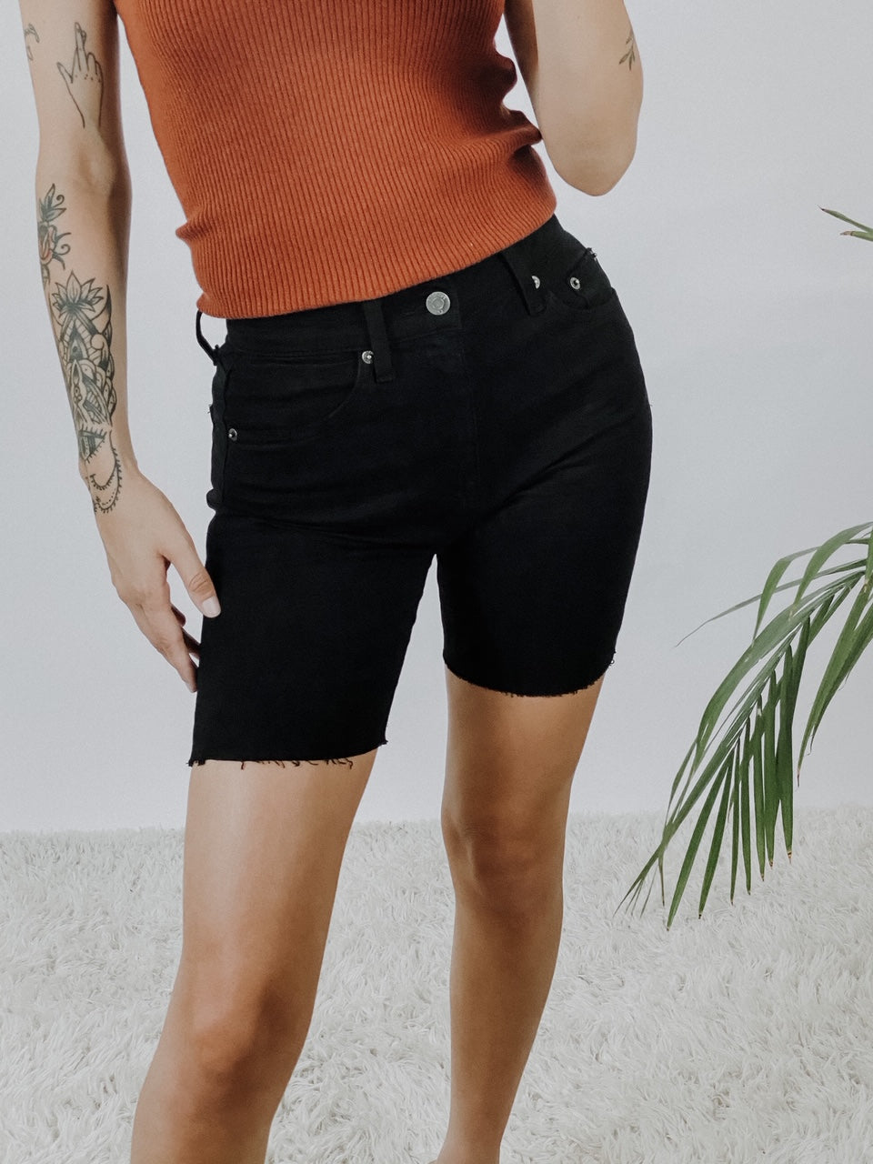 The Izzy is a high rise slim biker short. This style in black Redemption features a scissor cut hem.