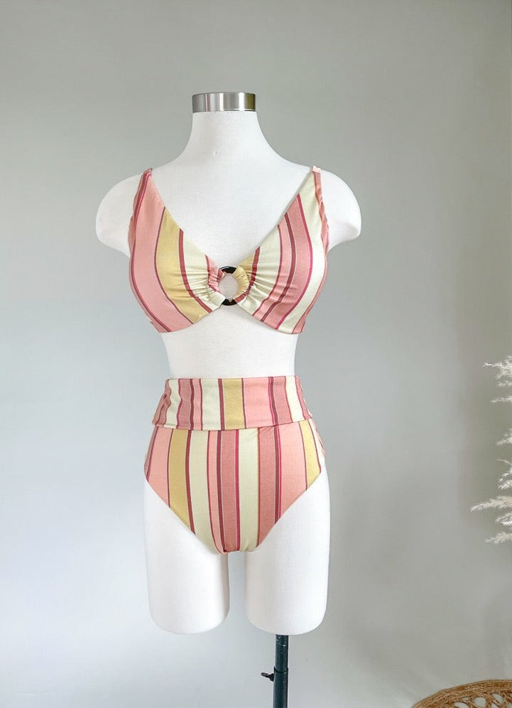 The Fira Stripe Tri Top is the perfect match to the Fira Stripe Fold Down Pant. They both feature beautiful neutral "marigold" stripes. This top features removable cups for shape and support, adjustable straps and multi-fit adjustable e-hook for the perfect fit, with a resin look trip detail to elevate the design. You'll be so glad to have this swimwear on your next trip!