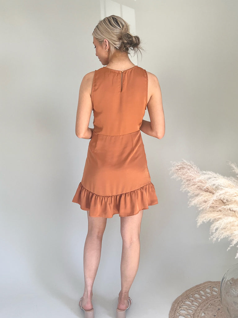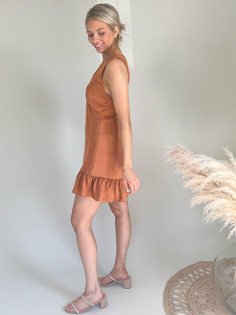 The Columba Dress in Bronze features a classic feminine silhouette. With a round neck, A-Line details, a ruffled hem and hidden zipper, this dress is extremely versatile and easy to wear.
