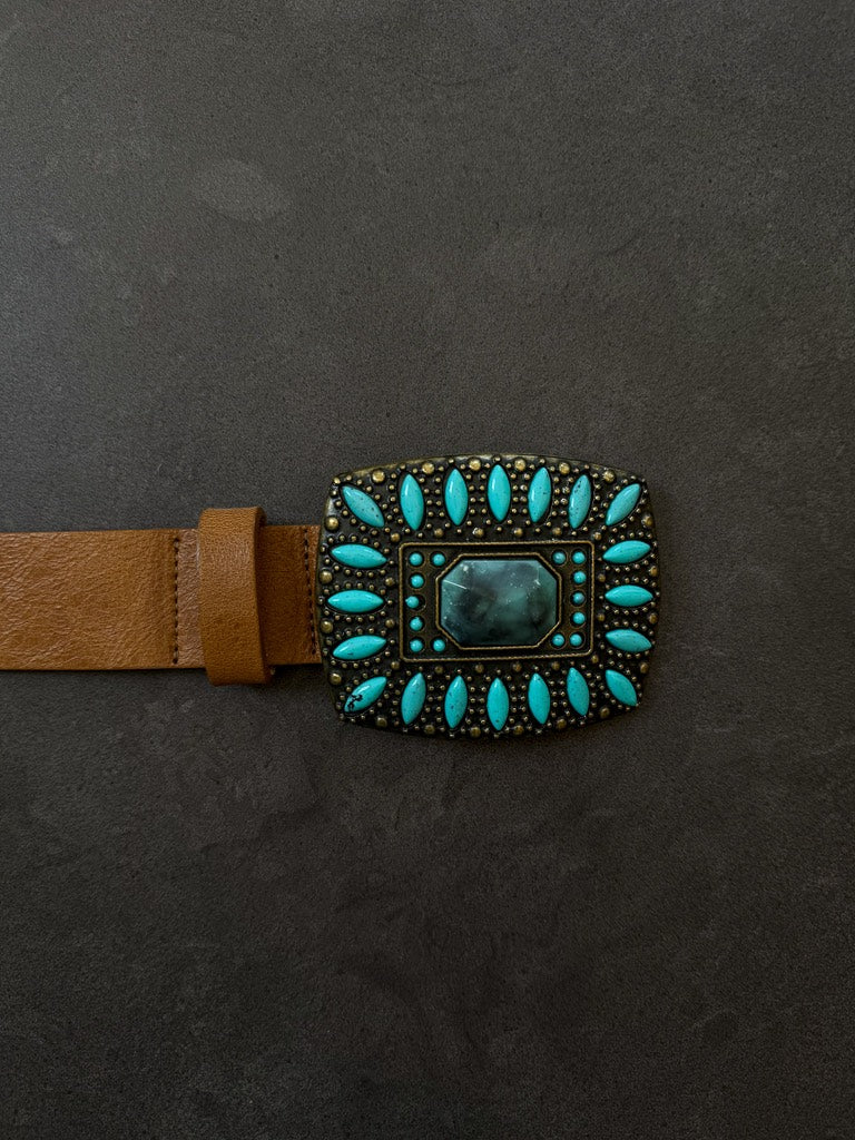 The tan Italian leather is the perfect neutral backdrop the the absolutely bold and beautiful brass and turquoise buckle.