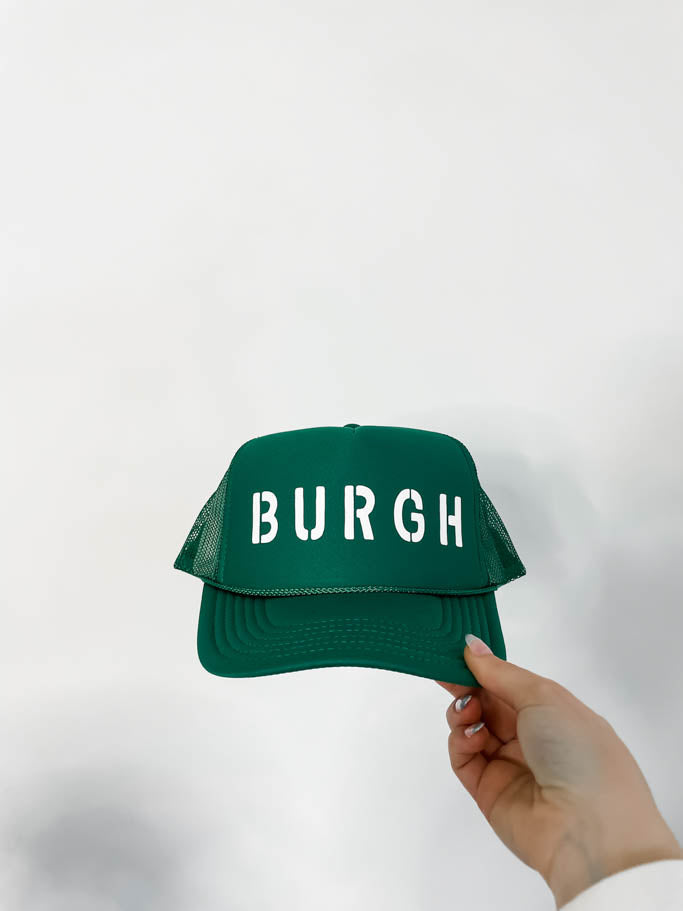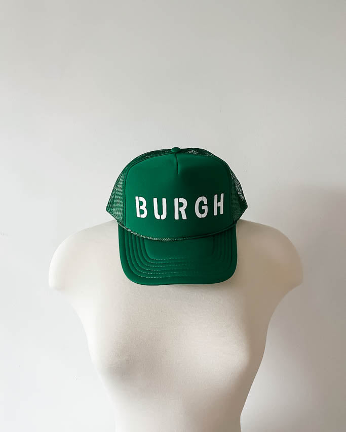 The original design of The Burgh apparel. The Burgh trucker hat in kelly green with white print.