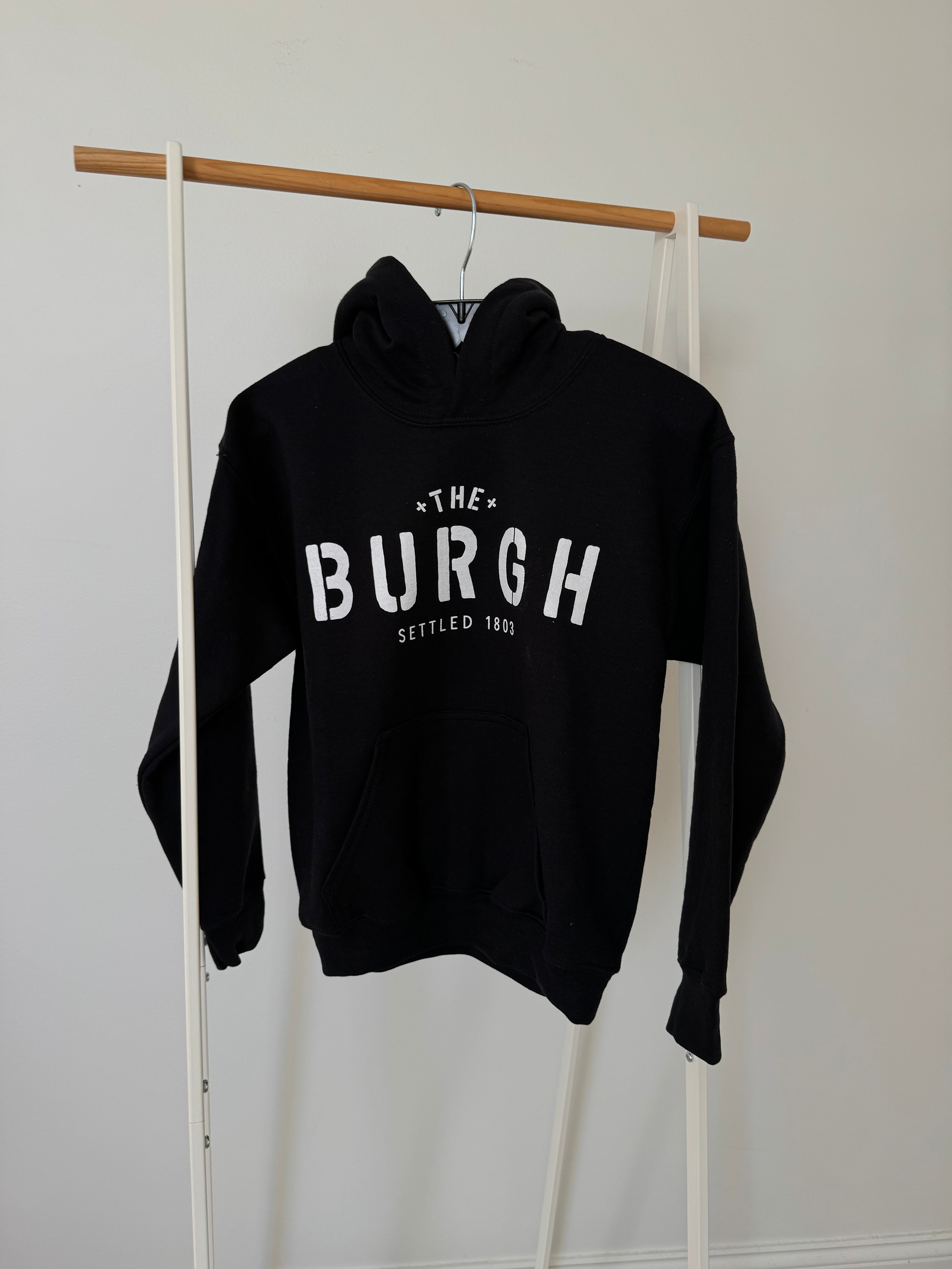 The Youth Burgh Hoodie in Black with White screen printing fits true to size and can be layered perfectly with joggers or denim. The Original BURGH apparel is created right here in the heart of historic downtown Newburgh, located on the Ohio River.