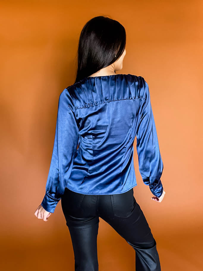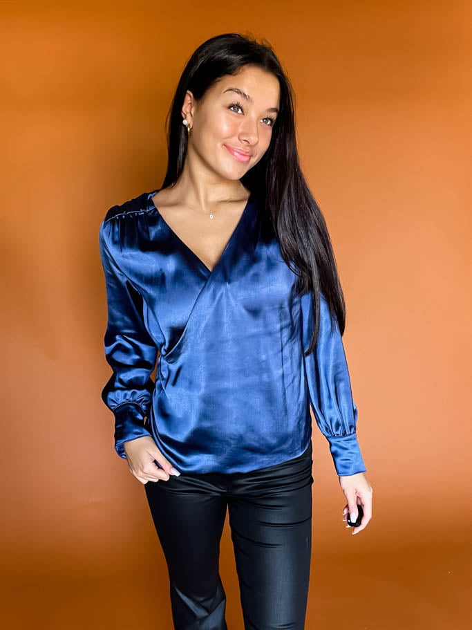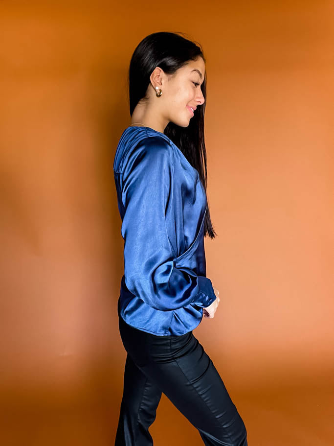 This romantic Alessandra Satin Blouse is a moment. The rich sapphire navy satin is dreamy. It has a slimming cut, faux wrap front, hidden side zipper, ruched details on the shoulders and upper back, this is a must see!