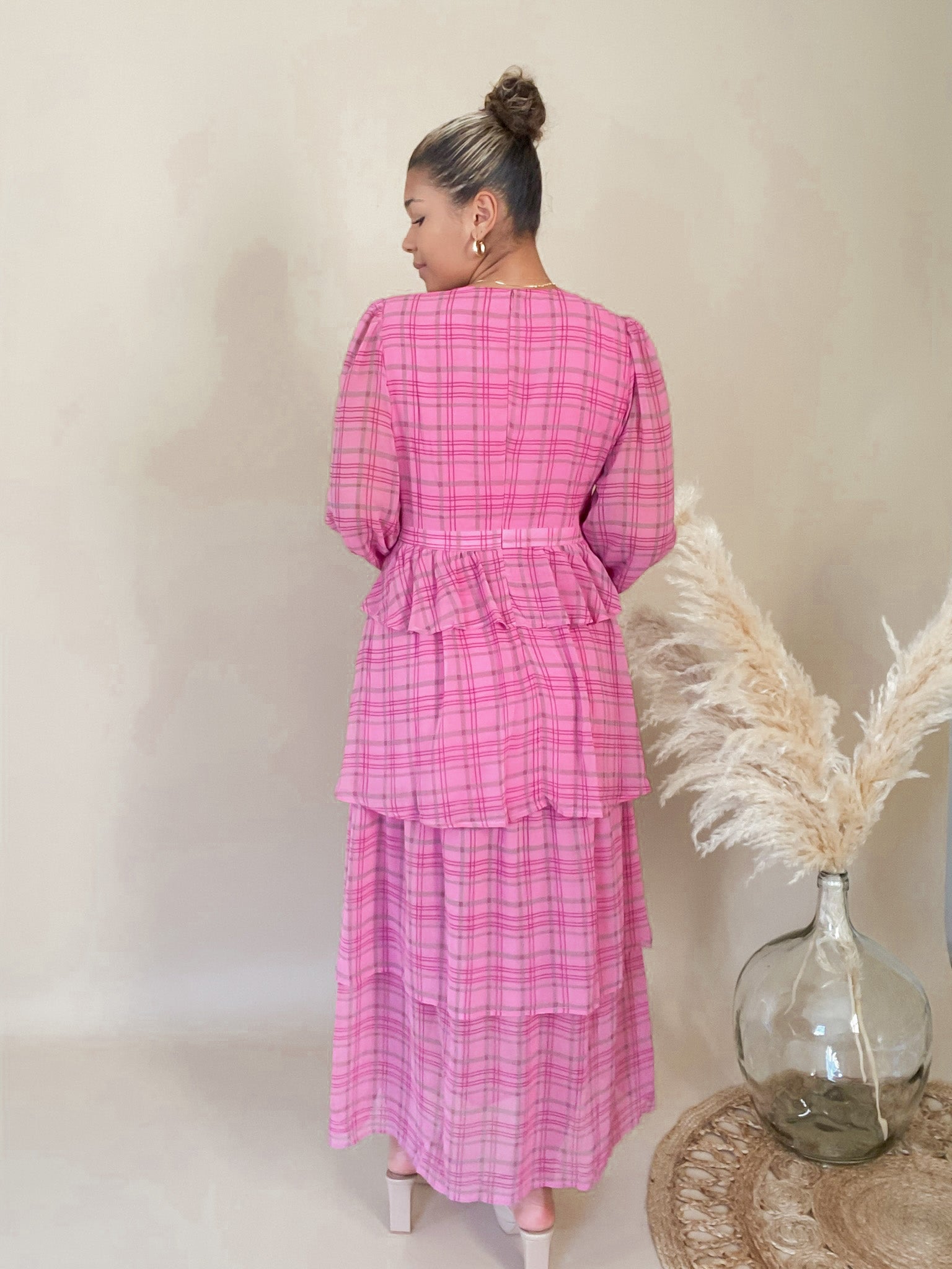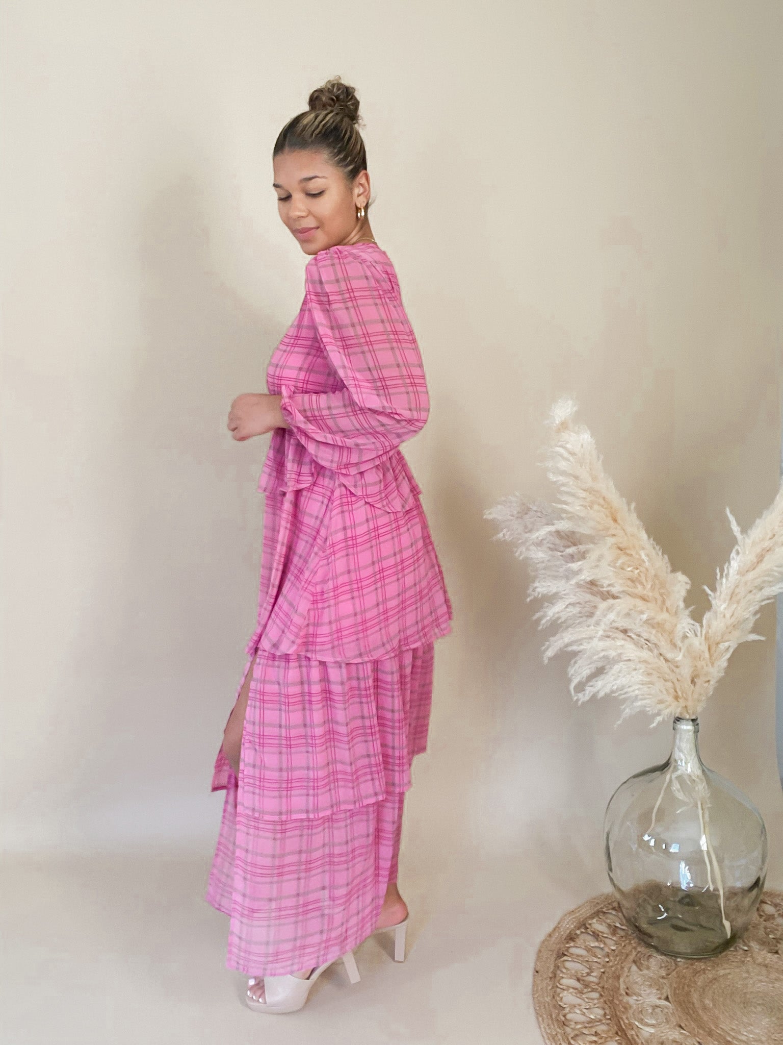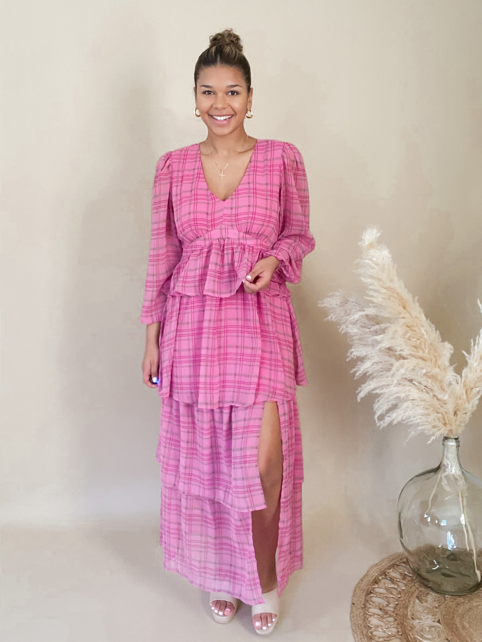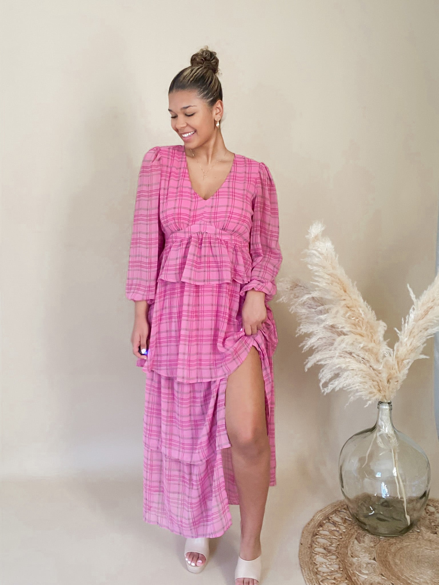 Spice up your life with some color! The multi-tiered Ginger Maxi Dress features a deep V-neck, slit up the side and a beautiful plaid texture. Wear with one of our Jackets to instantly elevate the look. Party pink is a year-'round favorite so plan to wear this plenty!