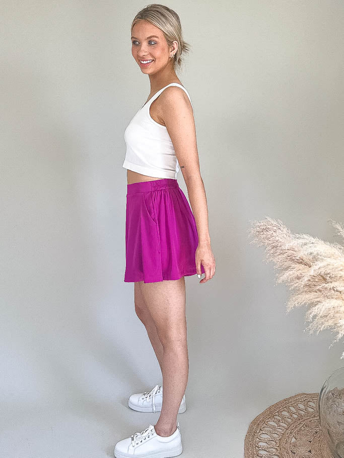 These Fuchsia shorts feel like pajamas, but look glam! The Grant is a satin short with a flat front waistband and elastic in the back, jetted pockets along a wide flowy leg opening. These shorts are endlessly versatile. Dress them up with a cute heel or wear them with sandals and a graphic tee.