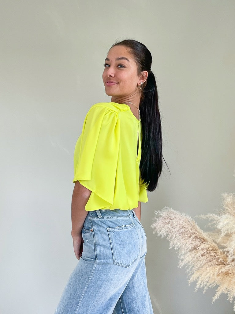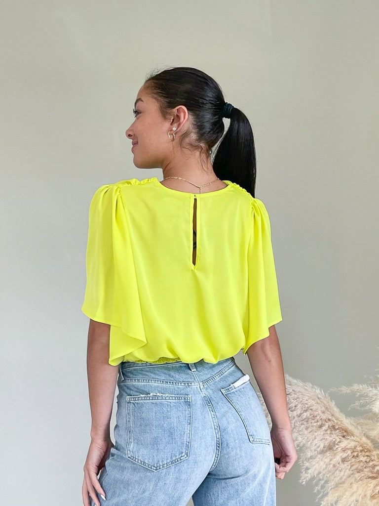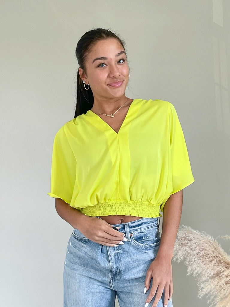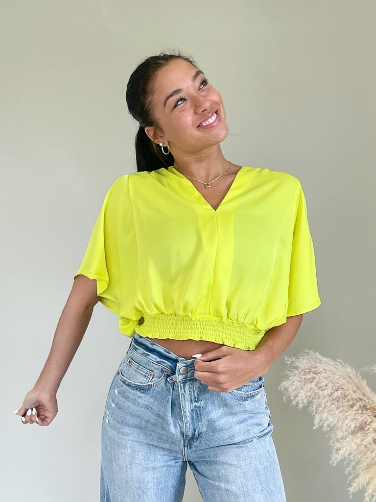 The Helia Blouse is a stylish addition to any wardrobe. Featuring a deep V-neck, smocked waist, and key hole back, this blouse has a figured flattering silhouette. The luxe satin fabric and flowy sleeves offer a stylish look in a bold, lime green hue.