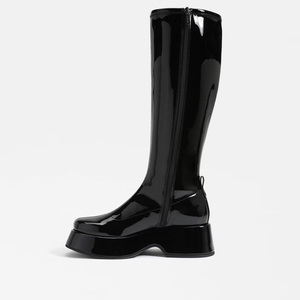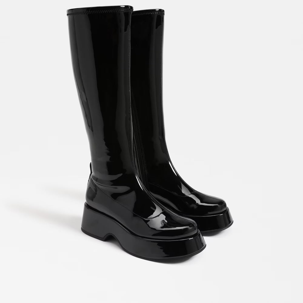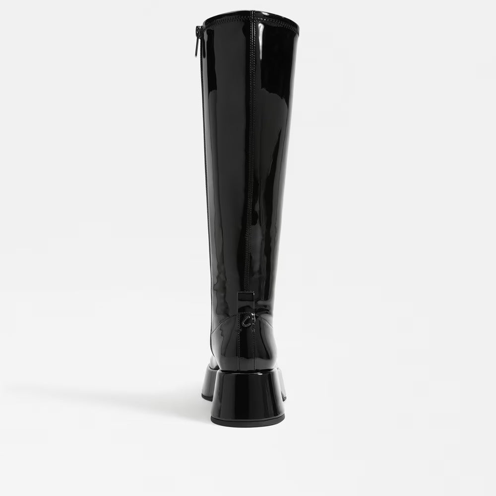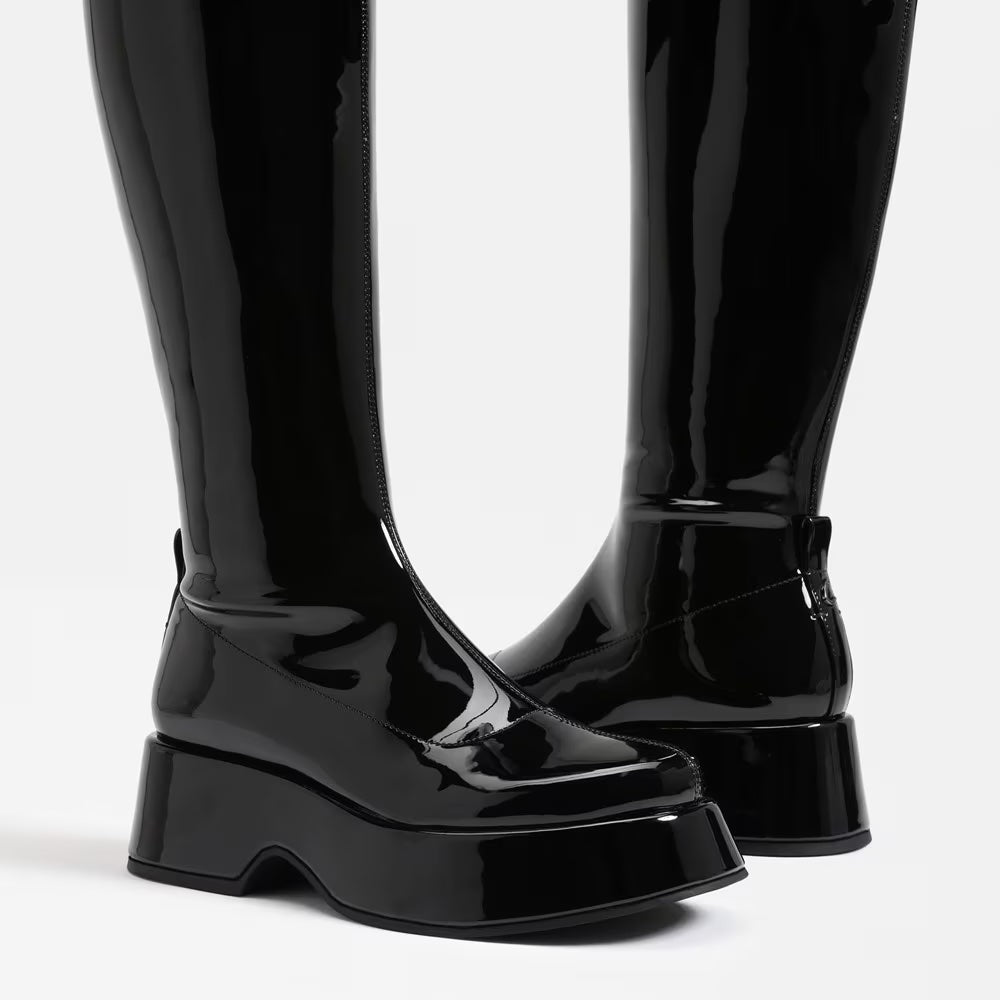 The Kimberly Boot by Sam Edleman - Circus NY, is a glossy patent boot with a fitted silhouette and a stacked platform sole.