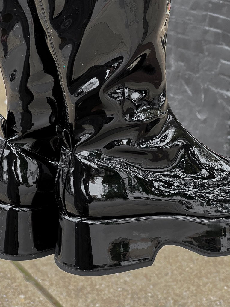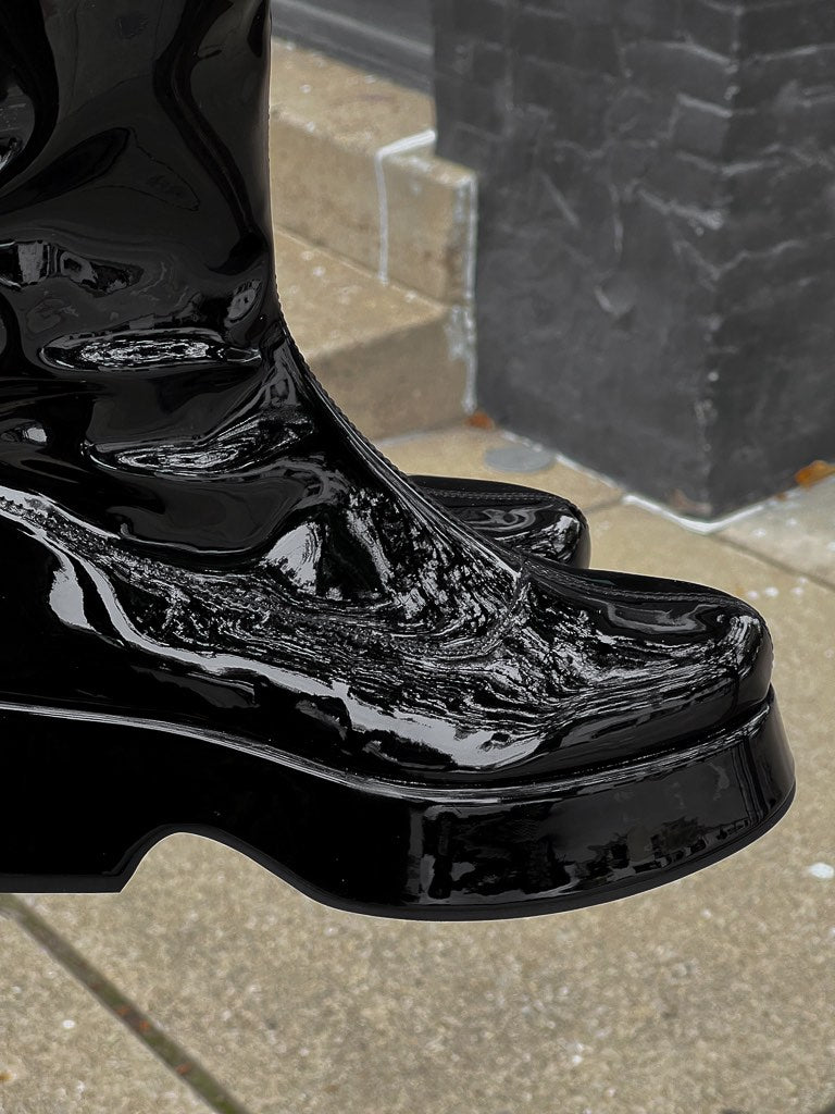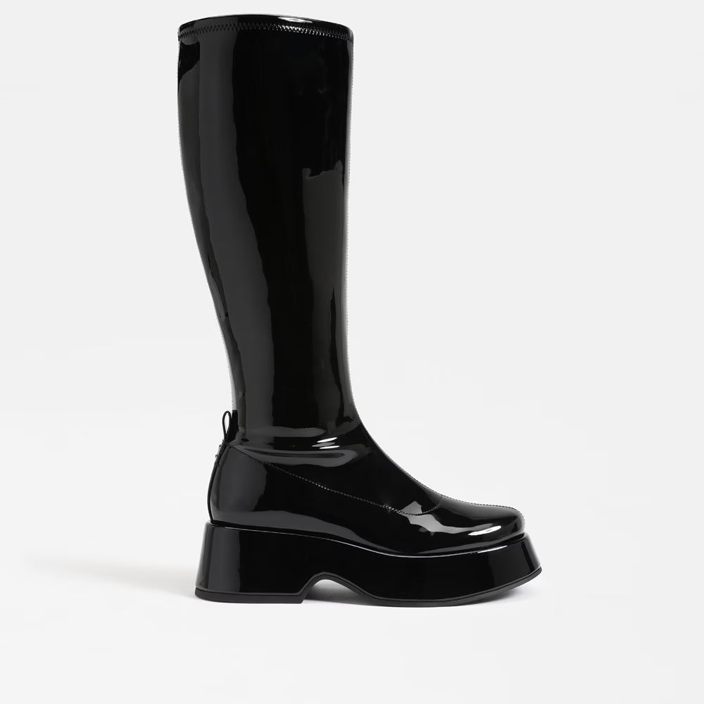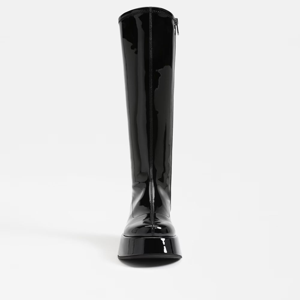 The Kimberly Boot by Sam Edleman - Circus NY, is a glossy patent boot with a fitted silhouette and a stacked platform sole.