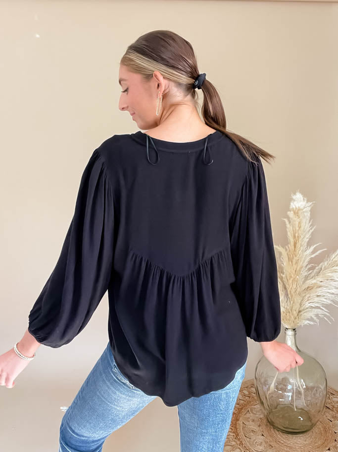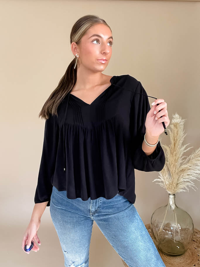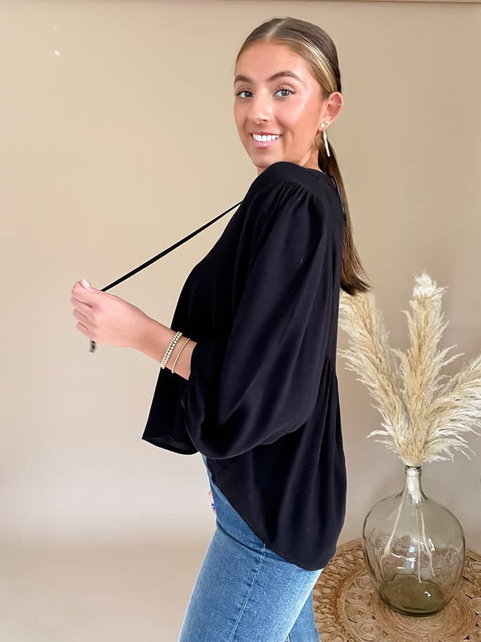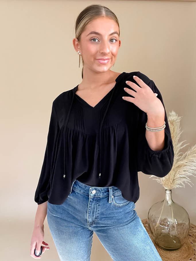 Elevate your day-to-day style with this subtly detailed blouse. The Luciana Top features a V-pleated neckline, beaded tassel tie, balloon sleeve, and flattering V-shaped empire gathering around the body.