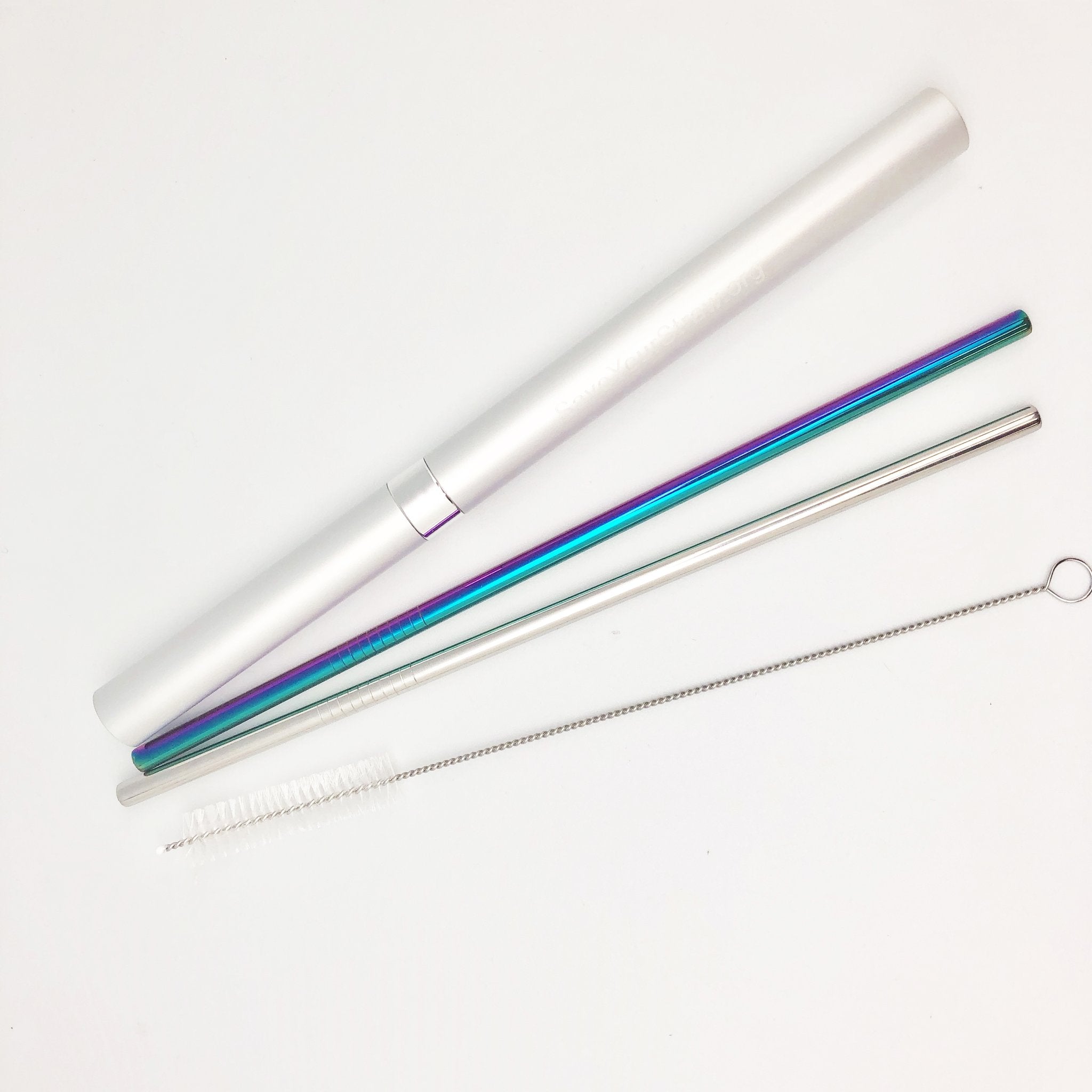 Each pack comes with 2 18/8Stainless Steel Straws in a convenient travel case- One will be the same color as your travel case choice and the other is a fun multicolored iridescent straw.
