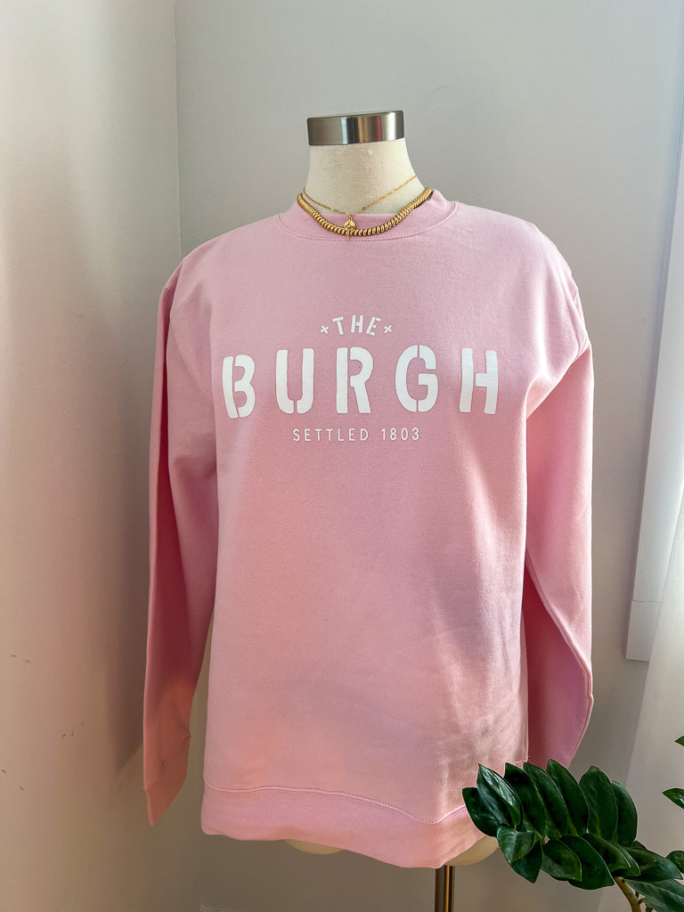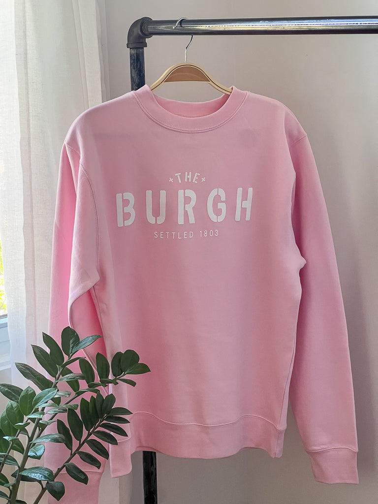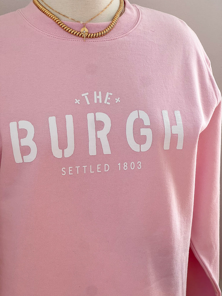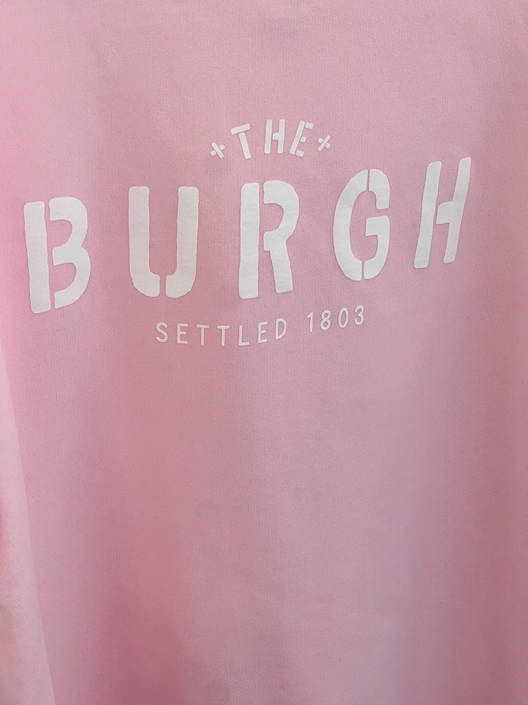 The Burgh Crew Sweatshirt in Light Pink with White screen printing fits true to size and can be layered perfectly with joggers or denim. The Original BURGH apparel is created right here in the heart of historic downtown Newburgh, located on the Ohio River.